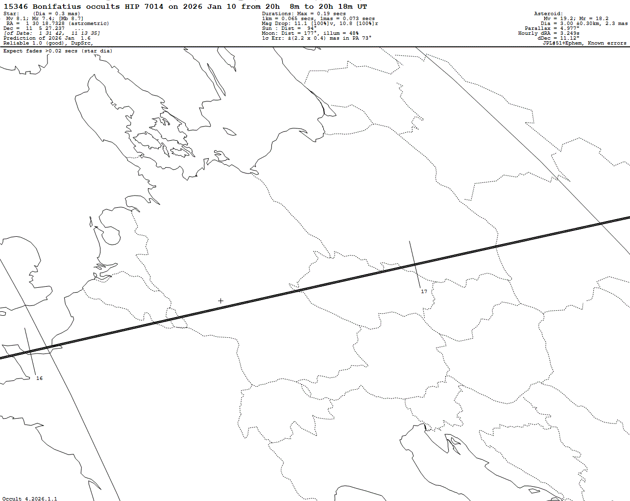 Bright star! Very short max. duration of only 0.19 s! Last update: 2026 Jan 01, Occult Watcher Cloud: https://cloud.occultwatcher.net/event/1835-15346-21606-648705-H7014 Post navigation 2026 Jan 10 ~20:49 UT: (13199) 1997 EW25 occults HIP 3574 (7.6 mag) 2026 Jan 10 ~19:03 UT: (21776) Krysczynska occults J050945.80+230126.7 (6.8 mag)