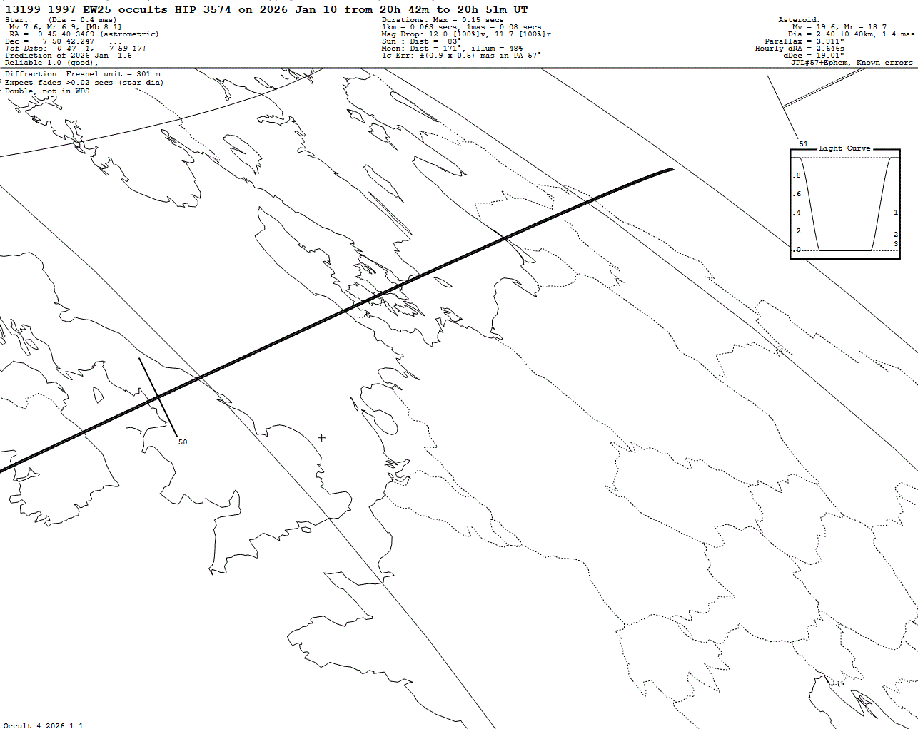 Bright star! Very short max. duration of only 0.15 s! Last update: 2026 Jan 01, Not in Occult Watcher Cloud Post navigation 2026 Jan 10 ~23:07 UT: (340) Eduarda occults UCAC4 553-046906 (13.0 mag) 2026 Jan 10 ~20:15 UT: (15346) Bonifatius occults HIP 7014 (8.1 mag)