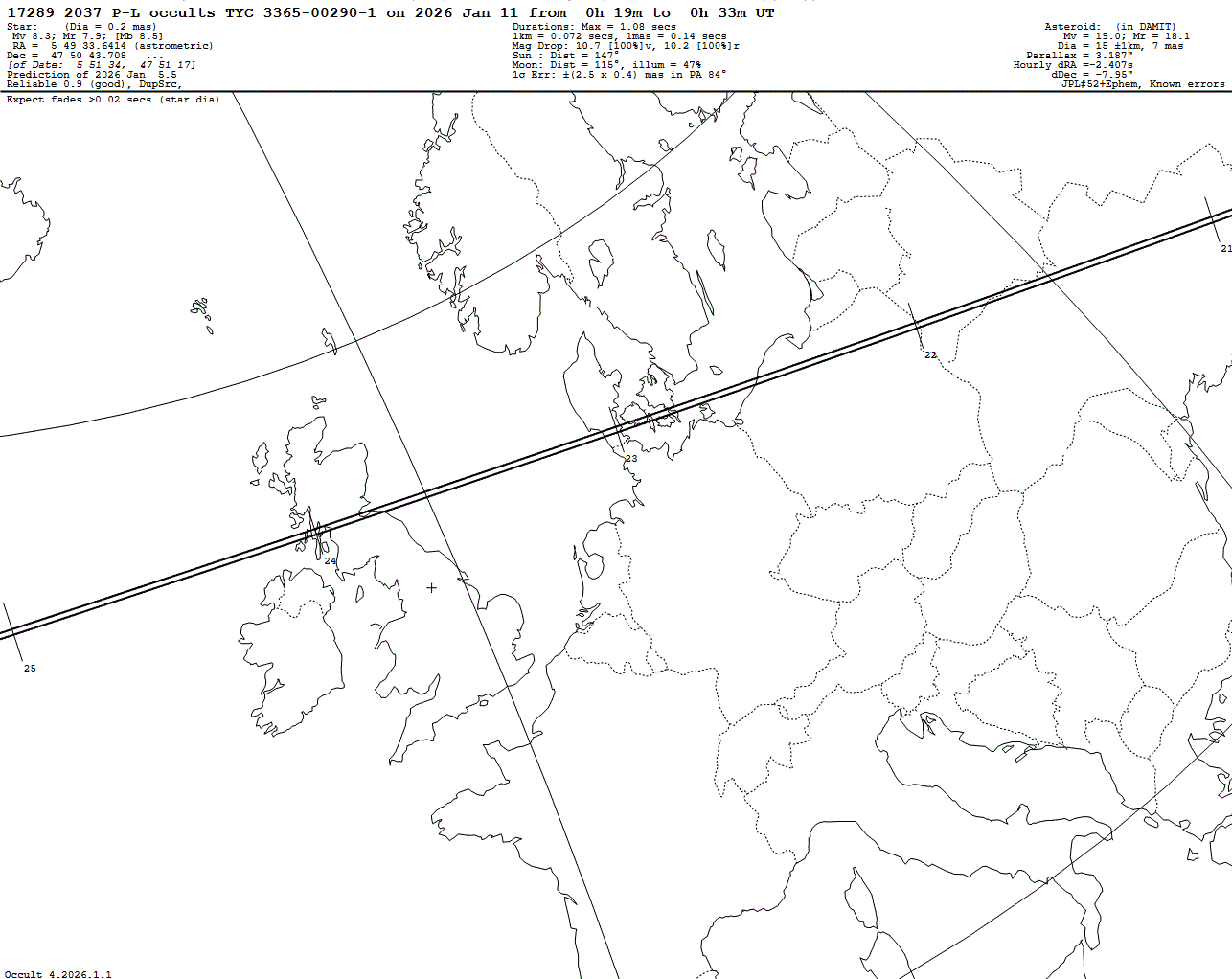 Bright star! Last update: 2026 Jan 05, Occult Watcher Cloud: https://cloud.occultwatcher.net/event/1836-17289-82838-651007-T00290-1 Post navigation 2026 Jan 11 ~03:05 UT: (4221) Picasso occults UCAC4 402-051388 (12.2 mag) 2026 Jan 10 ~23:07 UT: (340) Eduarda occults UCAC4 553-046906 (13.0 mag)