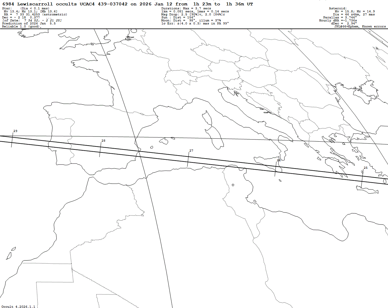 Suspected binary asteroid! Faint star! Last update: 2026 Jan 05, Occult Watcher Cloud: https://cloud.occultwatcher.net/event/1837-6984-107175-647852-U037042 GAIAMOONS link: https://gaiamoons.imcce.fr/occ.php?p=101890 Post navigation 2026 Jan 12 ~20:24 UT: (197) Arete occults TYC 4674-00881-1 (8.9 mag) 2026 Jan 11 ~03:05 UT: (4221) Picasso occults UCAC4 402-051388 (12.2 mag)