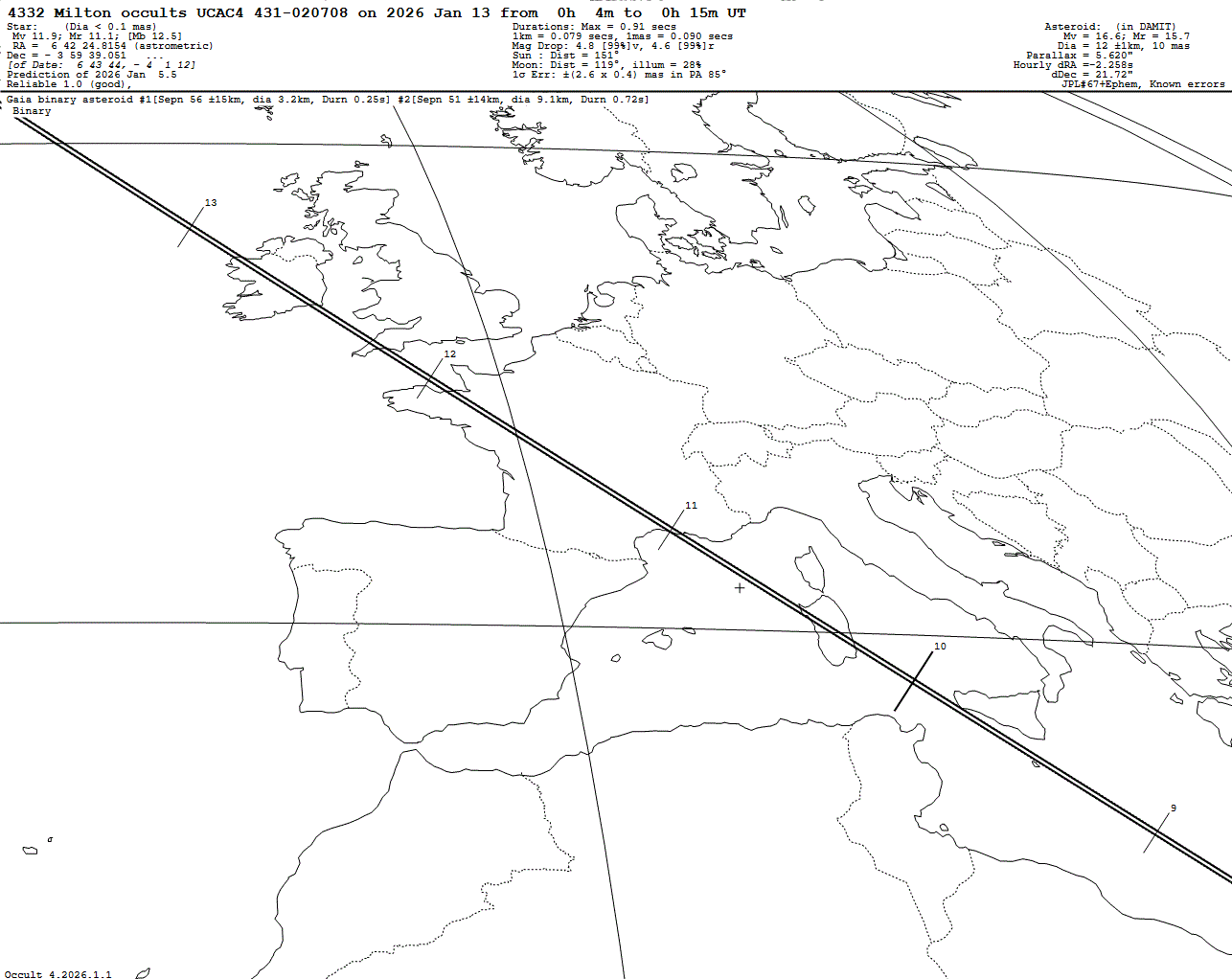 The main body is 10.8 km wide, with a satellite between 2 and 10 km wide.  The uncertainty for the satellite’s position is ±250 km around the centrality for the maximum uncertainty. Every observer within this range is invited to contribute. The satellite has a peak probability position between 10 km south and 20 km south of the centrality.