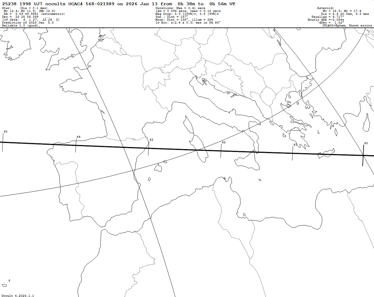 Suspected binary asteroid! Short max. duration of only 0.41 s! Last update: 2026 Jan 05, Occult Watcher Cloud: https://cloud.occultwatcher.net/event/1838-25238-85165-649472-U021989 GAIAMOONS link: https://gaiamoons.imcce.fr/occ.php?p=104233 Post navigation 2026 Jan 13 ~00:58 UT: (206) Hersilia occults UCAC4 546-033657 (14.0 mag) 2026 Jan 13 ~00:09 UT: (4332) Milton occults UCAC4 431-020708 (11.9 mag)