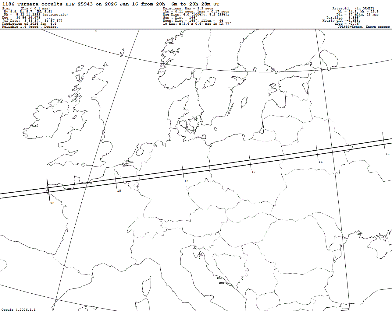 Bright star! Last update: 2026 Jan 06, Occult Watcher Cloud: https://cloud.occultwatcher.net/event/1841-1186-78687-650197-H25943 Post navigation 2026 Jan 16 ~22:27 UT: (2638) Gadolin occults HIP 12015 (8.9 mag) 2026 Jan 16 ~16:50 UT: (10227) Izanami occults J052252.36+143545.1 (8.7 mag)