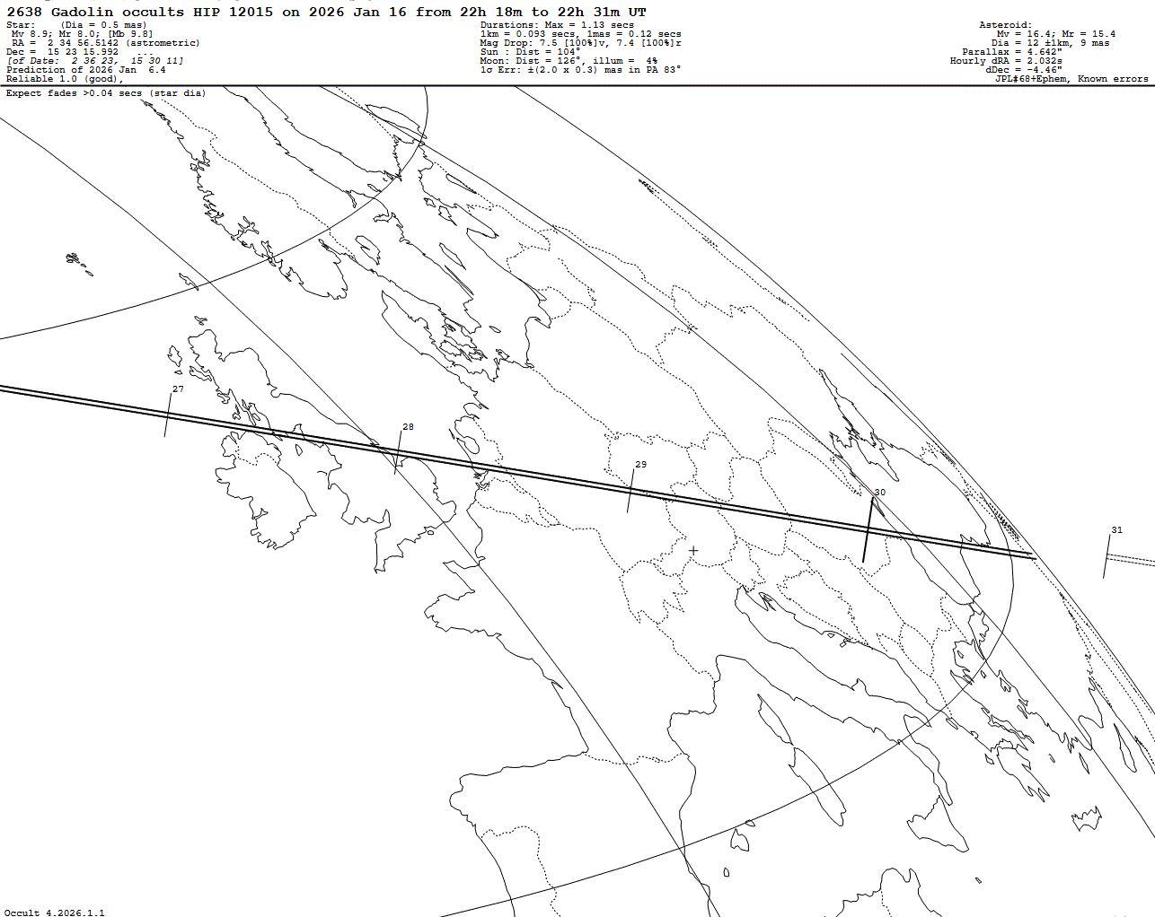 Bright star! Last update: 2026 Jan 06, Occult Watcher Cloud: https://cloud.occultwatcher.net/event/1841-2638-36848-648974-H12015 Post navigation 2026 Jan 17 ~21:06 UT: (49365) 1998 WR18 occults UCAC4 545-025360 (13.1 mag) 2026 Jan 16 ~20:16 UT: (1186) Turnera occults HIP 25943 (8.8 mag)