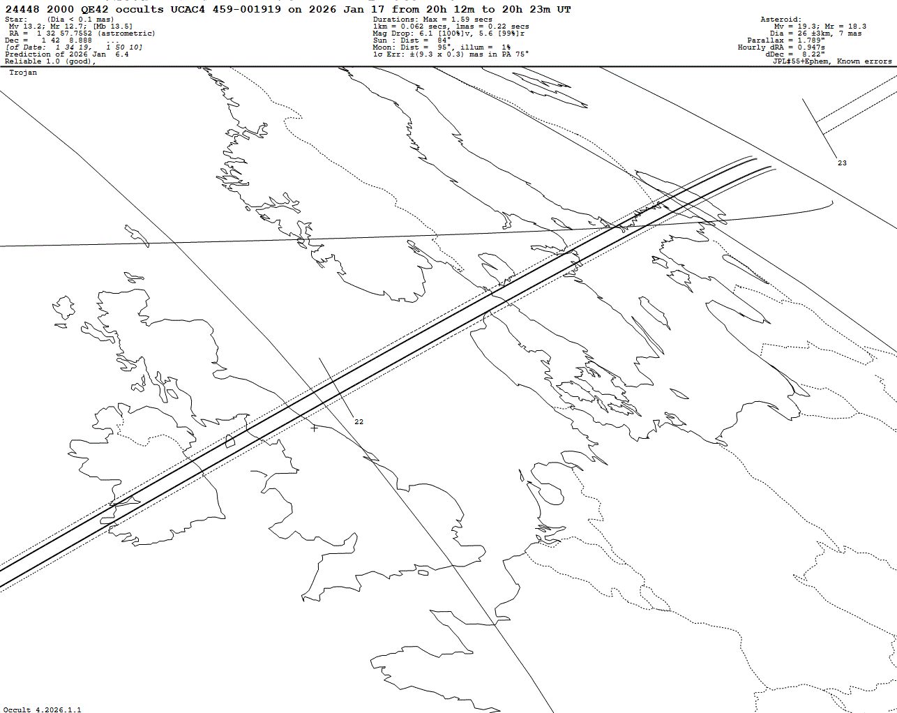 Jupiter Trojan! Faint star! Last update: 2026 Jan 06, Occult Watcher Cloud: https://cloud.occultwatcher.net/event/1842-24448-22221-648115-U001919 Prediction of the Lucky Star project (2025 Aug 21): https://lesia.obspm.fr/lucky-star/occ.php?p=149086 Post navigation 2026 Jan 04 ~22:40 UT: (617) Patroclus and Menoetius occult UCAC4 541-004490 (11.9 mag)
