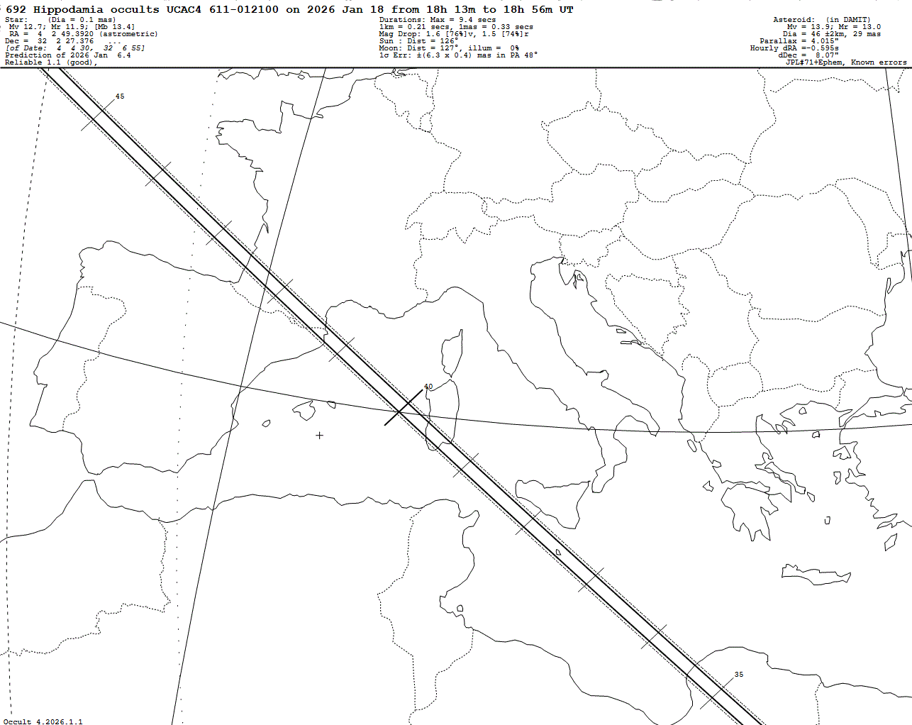 2026 Jan 18 ~18:37 UT: (692) Hippodamia occults UCAC4 611-012100 (12.7 mag)