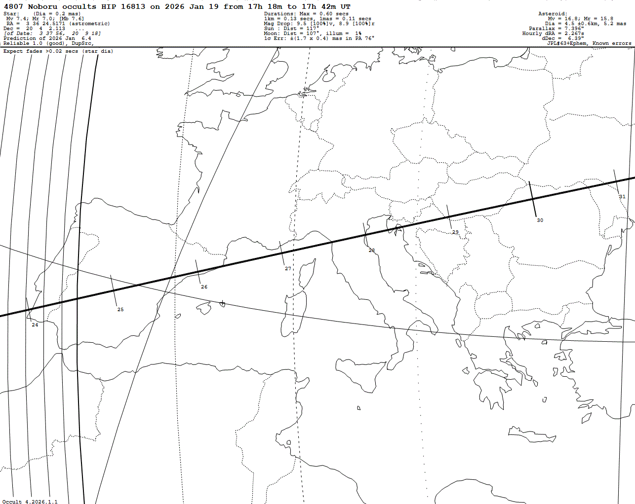 Bright star! Short max. duration of only 0.6 s! Last update: 2026 Jan 06, Occult Watcher Cloud: https://cloud.occultwatcher.net/event/1844-4807-51349-649266-H16813 Post navigation 2026 Jan 19 ~20:47 UT: (19126) Ottohahn occults UCAC4 454-043362 (13.5 mag) 2026 Jan 18 ~18:37 UT: (692) Hippodamia occults UCAC4 611-012100 (12.7 mag)