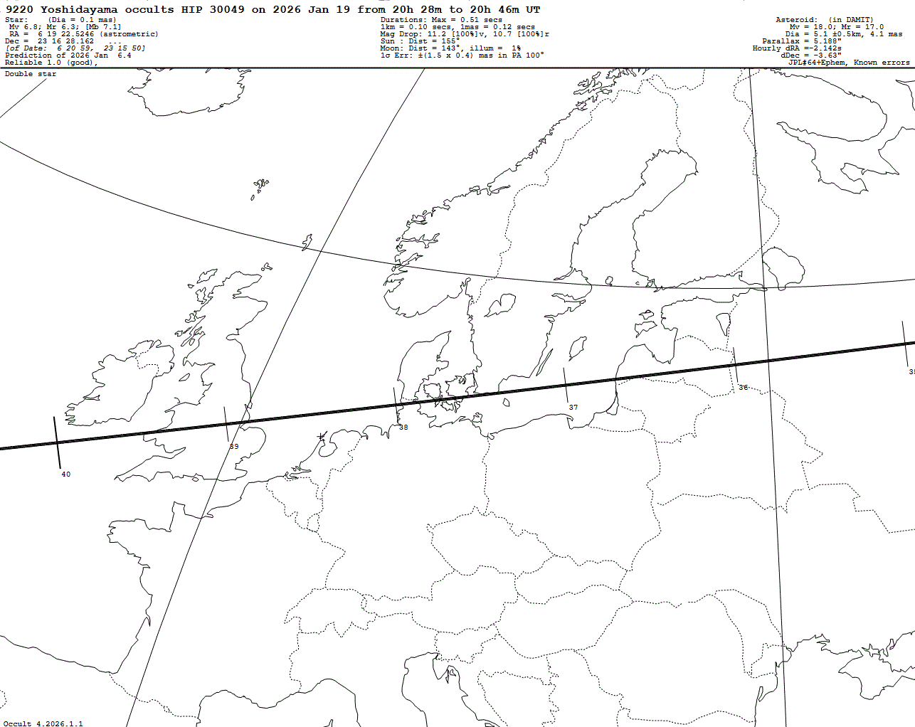 Bright star! Short max. duration of only 0.51 s! Last update: 2026 Jan 06, Occult Watcher Cloud: https://cloud.occultwatcher.net/event/1844-9220-89769-649462-H30049 Post navigation 2026 Jan 07 ~00:22 UT: (15024) 1998 TB occults TYC 1419-01260-1 (8.7 mag) 2026 Jan 19 ~20:47 UT: (19126) Ottohahn occults UCAC4 454-043362 (13.5 mag)