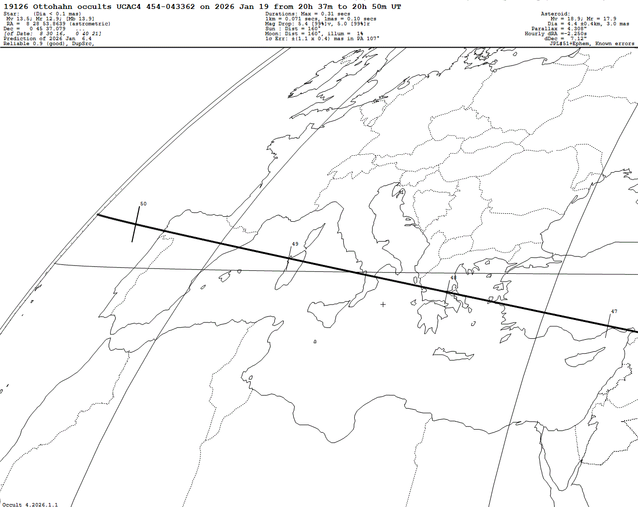 Suspected binary asteroid! Faint star! Short max. duration of only 0.31 s! Last update: 2026 Jan 06, Occult Watcher Cloud: https://cloud.occultwatcher.net/event/1844-19126-120229-648042-U043362 GAIAMOONS link: https://gaiamoons.imcce.fr/occ.php?p=92661 Post navigation 2026 Jan 19 ~20:36 UT: (9220) Yohisdayama occults HIP 30049 (6.8 mag) 2026 Jan 19 ~17:26 UT: (4807) Noboru occults HIP 16813 (7.4 mag)