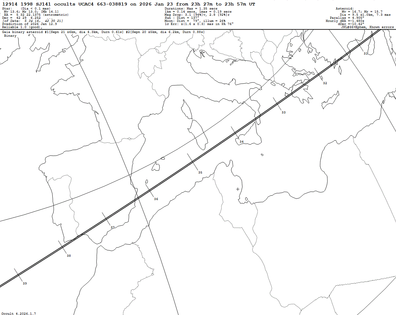 The main body is 10.2 km wide, with a satellite between 1.5 and 10 km wide. The occultation duration should last at least 0.22 s at the shortest estimate for the satellite and around 1.5 s for the primary. We recommend an maximum exposure time of 200 ms, the lower the better. You can record 1 mn after and before the event. The uncertainty for the satellite’s position is ±200 km around the centrality. Therefore every observer in this range are invited to contribute.