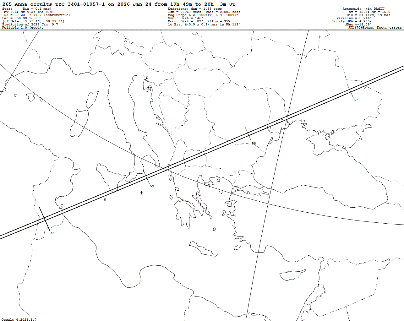 The main body is 24 km wide, with a satellite between 3 and 23 km wide. The occultation duration should last at least 0.19 s at the shortest estimate for the satellite and around 1.6 s for the primary. We recommend an maximum exposure time of 50-100 ms, the lower the better. You can record X1mn after and before the event. The uncertainty for the satellite’s position is ±120 km around the centrality. Therefore every observer in this range are invited to contribute.