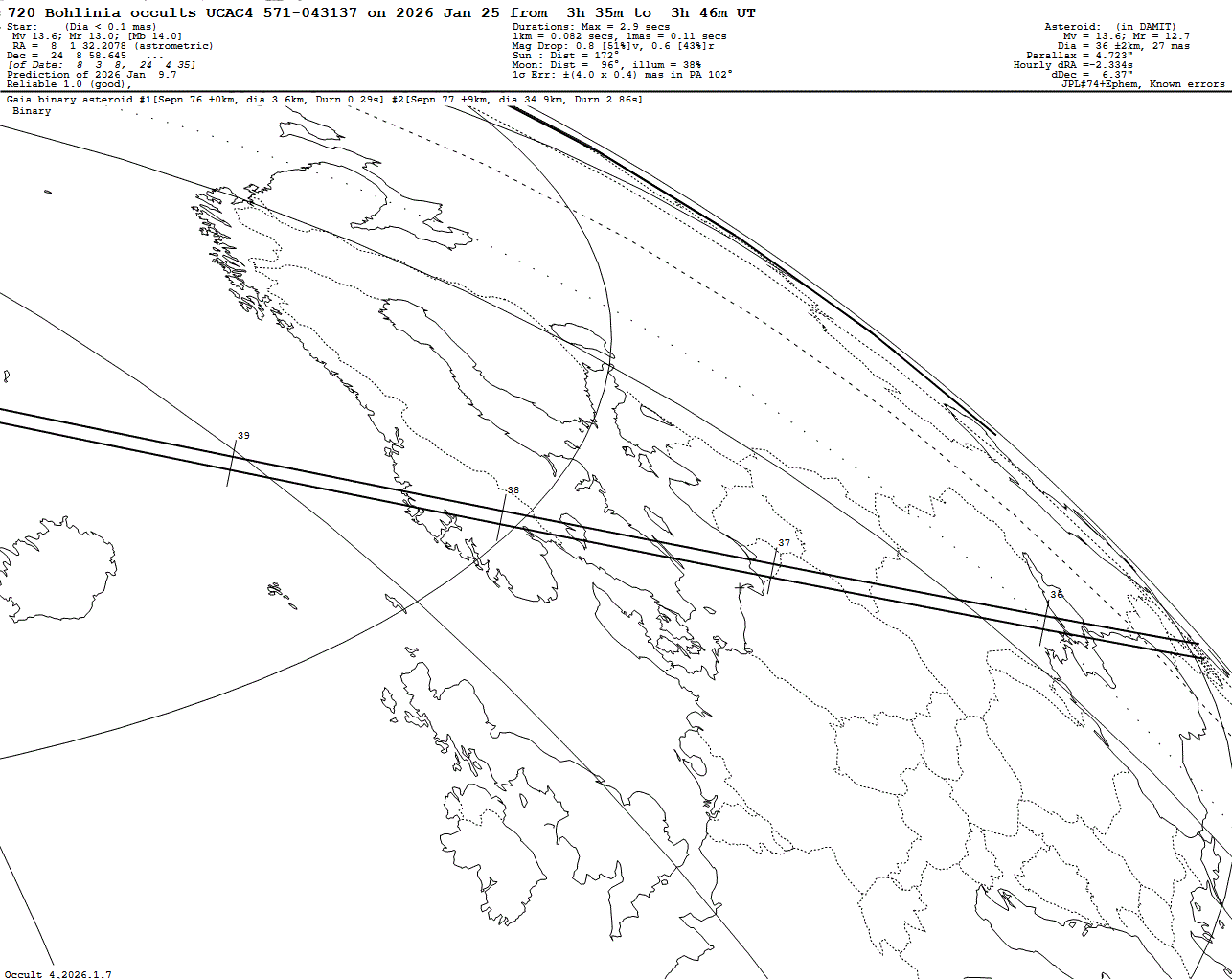 Suspected binary asteroid! Last update: 2026 Jan 09, Occult Watcher Cloud: https://cloud.occultwatcher.net/event/1850-720-113835-649513-U043137 GAIAMOONS link: https://gaiamoons.imcce.fr/occ.php?p=86183 Post navigation 2026 Jan 26 ~05:18 UT: (11855) Preller occults HIP 43970 (5.2 mag) 2026 Jan 25 ~01:05 UT: (22889) Donnablaney occults TYC 1906-00258-1 (7.6 mag)