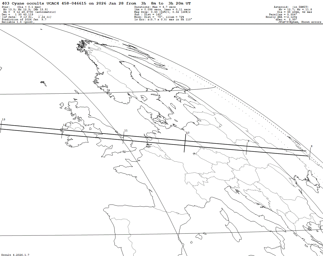 Suspected binary asteroid! Faint mag drop of only 0.43 mag! Last update: 2026 Jan 09, Occult Watcher Cloud: https://cloud.occultwatcher.net/event/1853-403-130497-648088-U046615 GAIAMOONS link: https://gaiamoons.imcce.fr/occ.php?p=91627 Post navigation 2026 Jan 28 ~04:57 UT: (19315) Aizunisshinkan occults HIP 46062 (8.6 mag) 2026 Jan 27~20:25 UT: (7825) 1991 TL1 occults TYC 5313-00294-1 (8.7 mag)