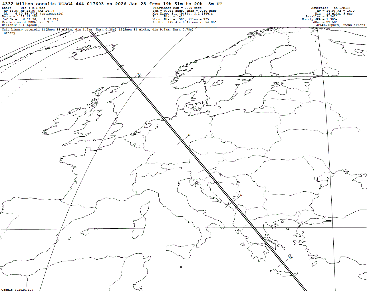 Suspected binary asteroid! Faint star! Short max. duration of only 0.99 s! Last update: 2026 Jan 09, Occult Watcher Cloud: https://cloud.occultwatcher.net/event/1853-4332-92354-647914-U017693 GAIAMOONS link: https://gaiamoons.imcce.fr/occ.php?p=102271 Post navigation 2026 Jan 29 ~20:29 UT: (3561) Devine occults TYC 4682-00955-1 (7.9 mag) 2026 Jan 28 ~04:57 UT: (19315) Aizunisshinkan occults HIP 46062 (8.6 mag)