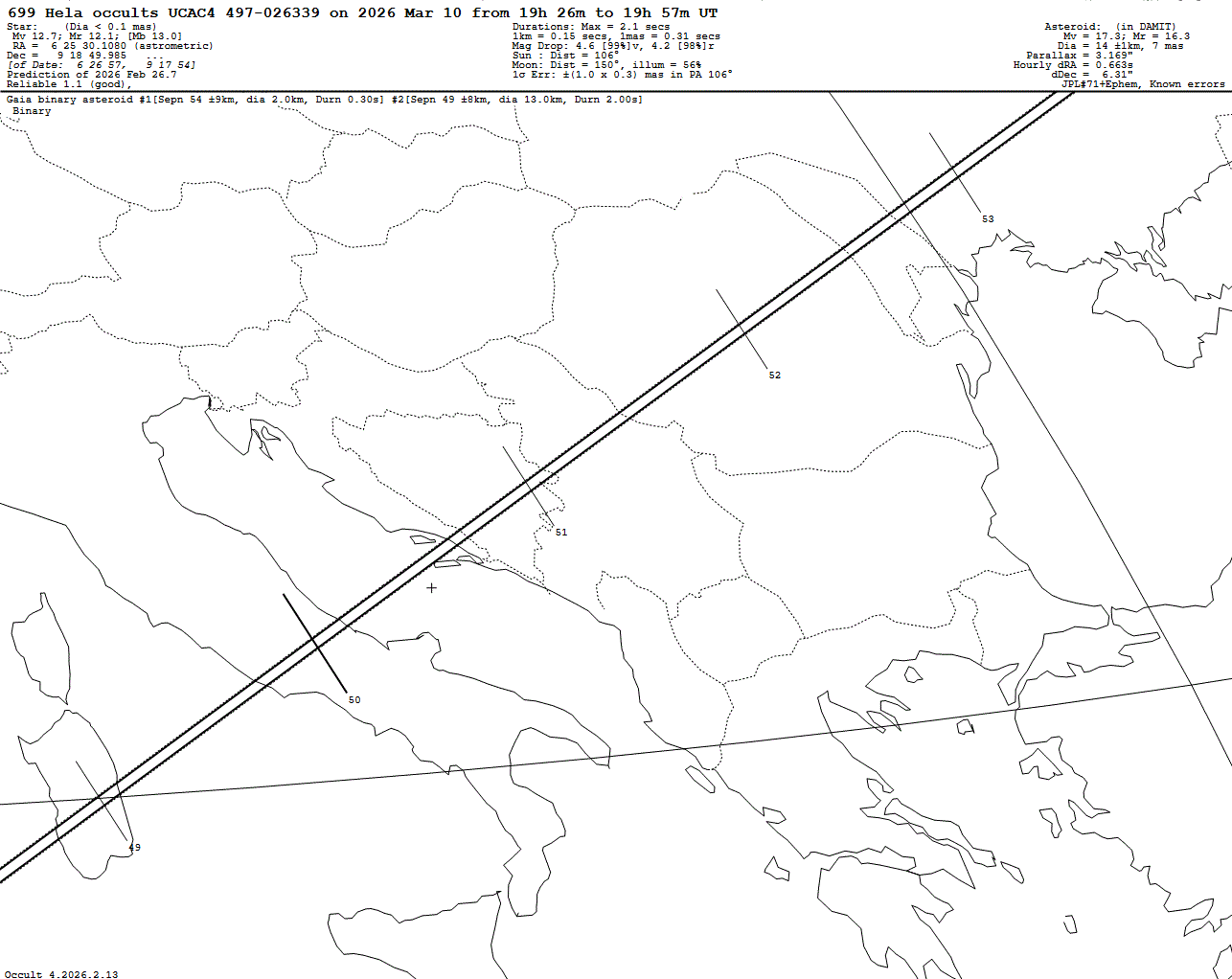 Suspected binary asteroid! Last update: 2026 Feb 26, Occult Watcher Cloud: https://cloud.occultwatcher.net/event/1894-699-91174-648584-U026339 GAIAMOONS link: https://gaiamoons.imcce.fr/occ.php?p=97150 Post navigation 2026 Feb 18 ~20:26 UT: (12914) 1998 SJ141 occults UCAC4 652-031970 (13.0 mag) 2026 Mar 09 ~02:44 UT: (29526) 1998 AV occults TYC 2492-01713-1 (11.4 mag)