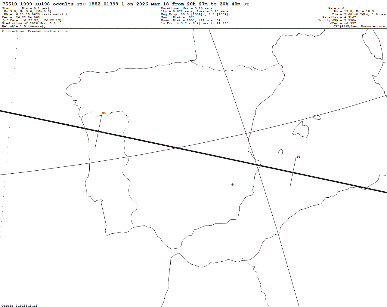 The main body is 3.3 km wide, with a satellite between 500 m and 3 km wide. We recommend an maximum exposure time around 10 ms. You can record 1 min after and before the event.