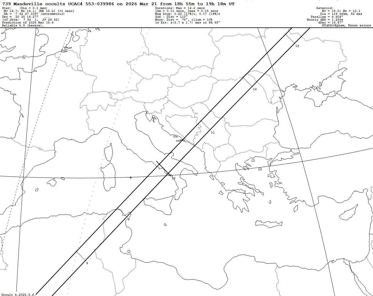 Slow-rotating asteroid! Faint star! Faint mag drop of only 0.20 mag! Last update: 2026 Mar 15, Occult Watcher Cloud: https://cloud.occultwatcher.net/event/1905-739-106974-649285-U039986 Post navigation 2026 Mar 23 ~23:01 UT: (266) Aline occults UCAC4 505-022092 (14.9 mag) 2026 Mar 21 ~01:30 UT: (886) Washingtonia occults UCAC4 644-045585 (13.3 mag)