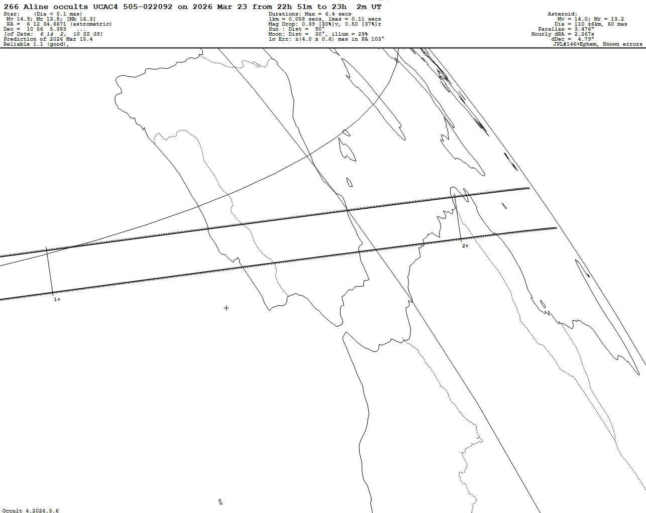 2026 Mar 23 ~23:01 UT: (266) Aline occults UCAC4 505-022092 (14.9 mag)
