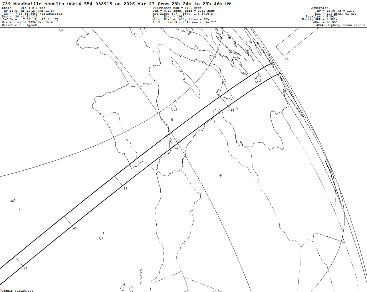 Slow-rotating asteroid! Last update: 2026 Mar 15, Occult Watcher Cloud: https://cloud.occultwatcher.net/event/1907-739-107243-649300-U038915 Post navigation 2026 Mar 24 ~21:47 UT: (266) Aline occults UCAC4 505-022319 (15.7 mag) 2026 Mar 23 ~23:01 UT: (266) Aline occults UCAC4 505-022092 (14.9 mag)