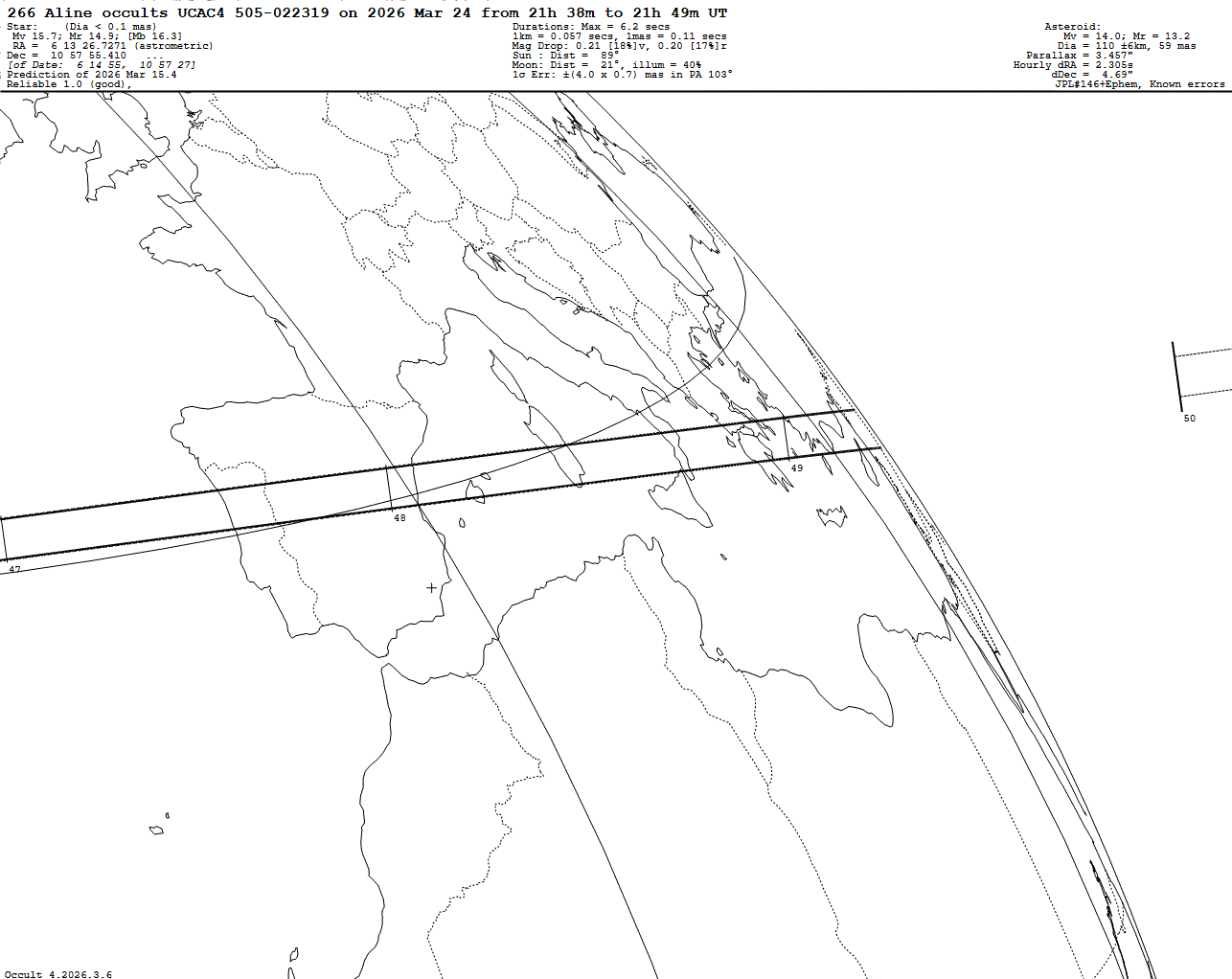 2026 Mar 24 ~21:47 UT: (266) Aline occults UCAC4 505-022319 (15.7 mag)