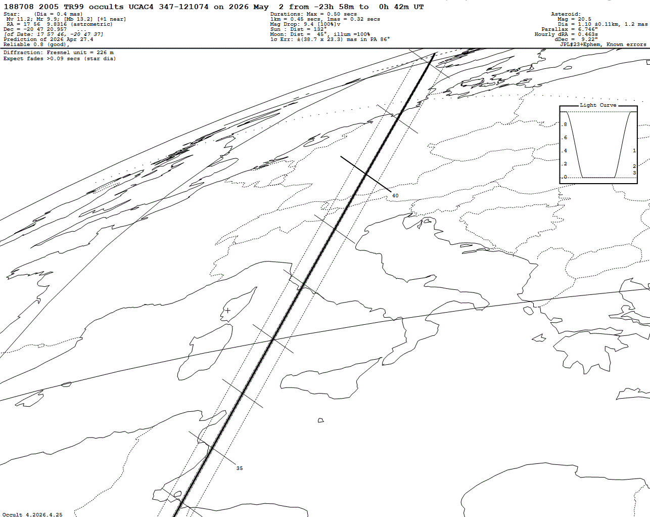 Short max. duration of only 0.50 s! Last update: 2026 Apr 27, Occult Watcher Cloud: https://cloud.occultwatcher.net/event/1947-188708-253941-646693-U121074 Post navigation 2026 May 02 ~02:06 UT: (24158) Kokubo occults HIP 79302 (4.7 mag) 2026 Apr 29 ~01:14 UT: (15404) 1997 VE8 occults UCAC4 321-218017 (8.6 mag)