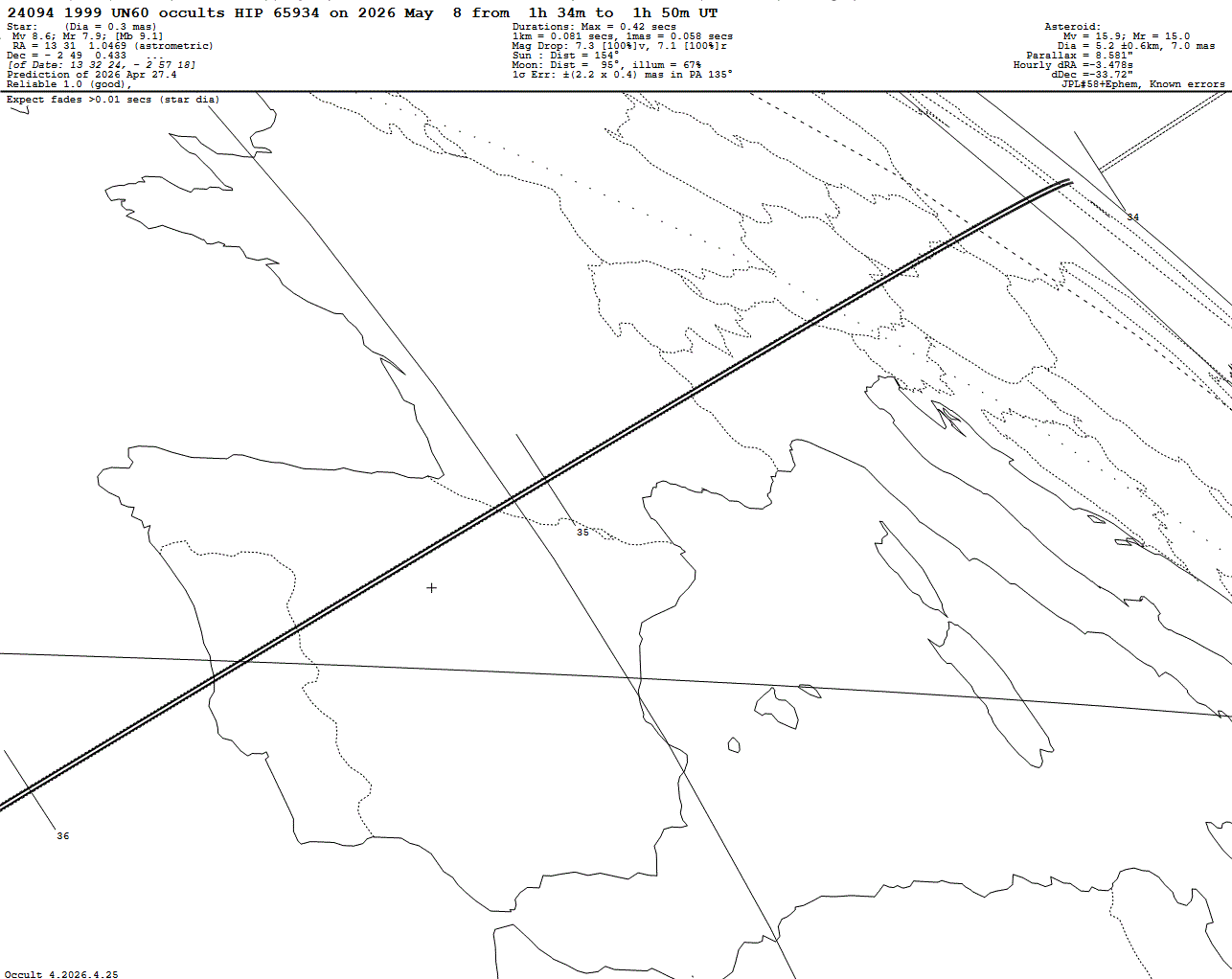 The main body is 5.2 km wide, with a satellite between 700 m and 4.9 km wide. The occultation duration should last at least 0.06 s at the shortest estimate for the satellite and around 0.4 s for the primary. We recommend an maximum exposure time of 10 ms as the star is bright. The uncertainty for the satellite’s position is ±150 km around the centrality.